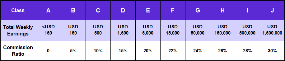 Your commission ratio depends on the total weekly earning of your hostesses and sub-agents. Check the chart below to know the details.